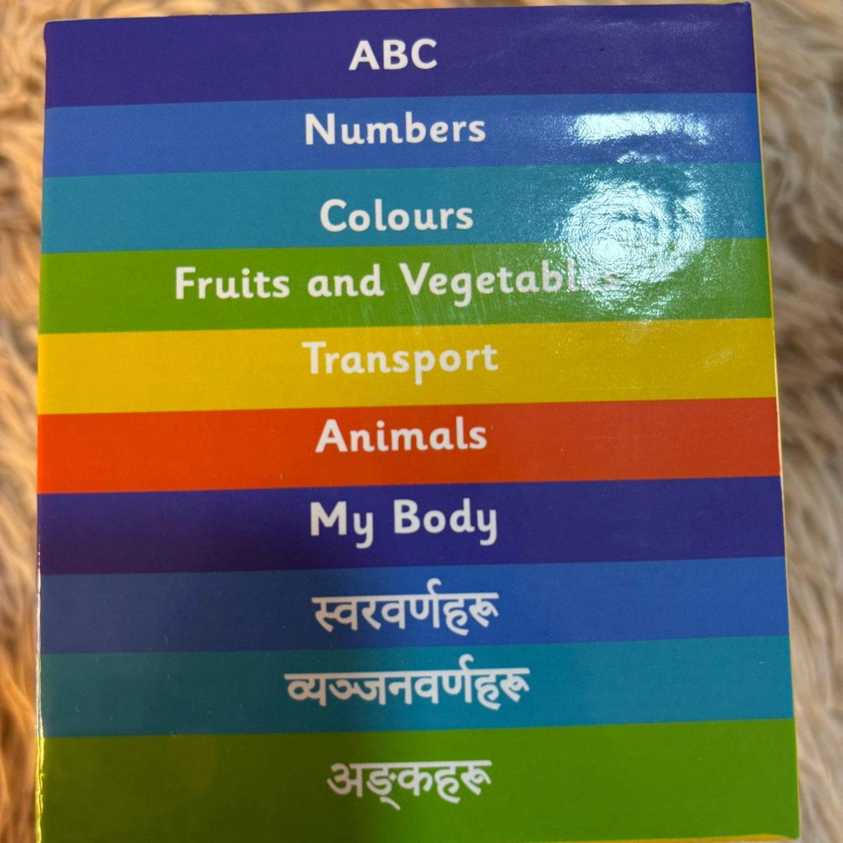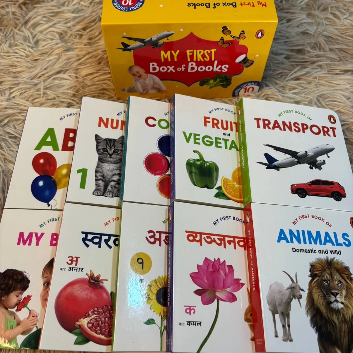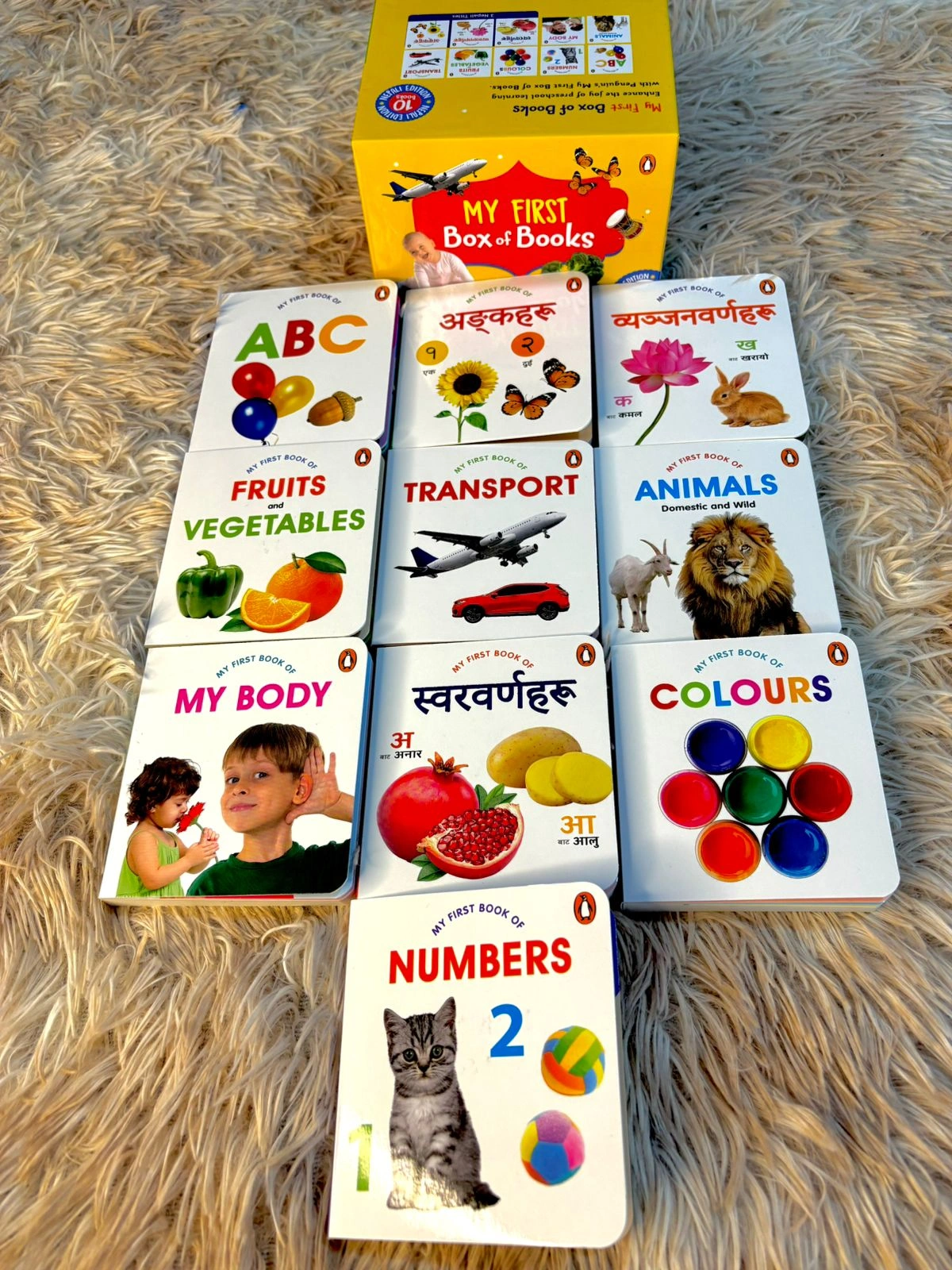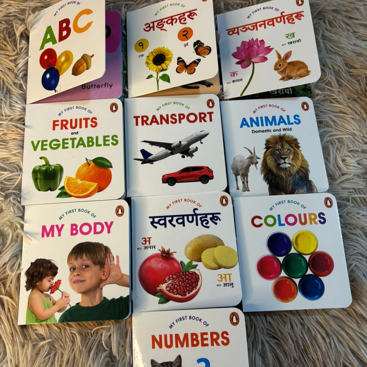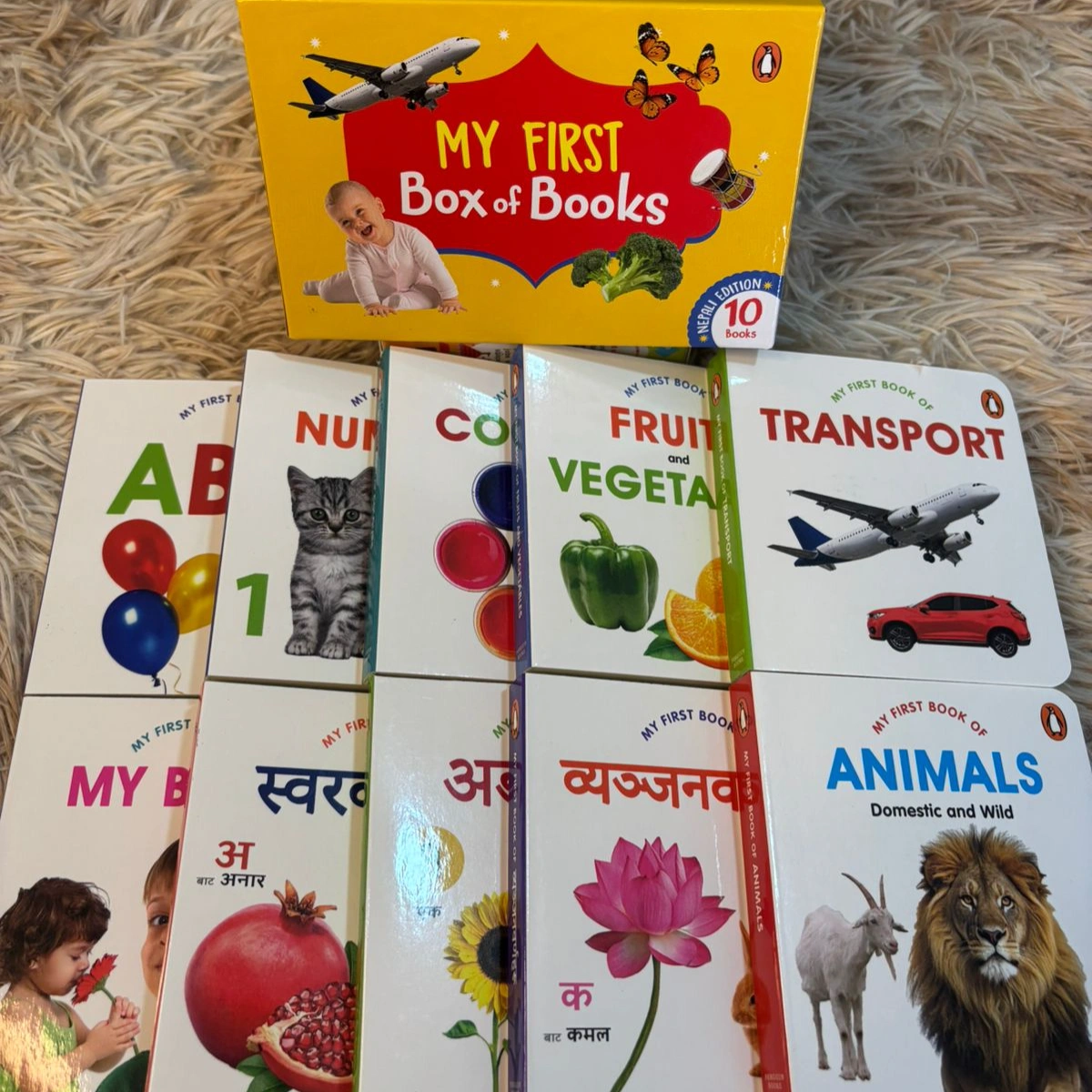 Set of 10 baby books in English and Nepali version Includes 7 sets in English and 3 sets(ka kha,yak dui, aaa, aahaa aaa yi yi) in Nepali.