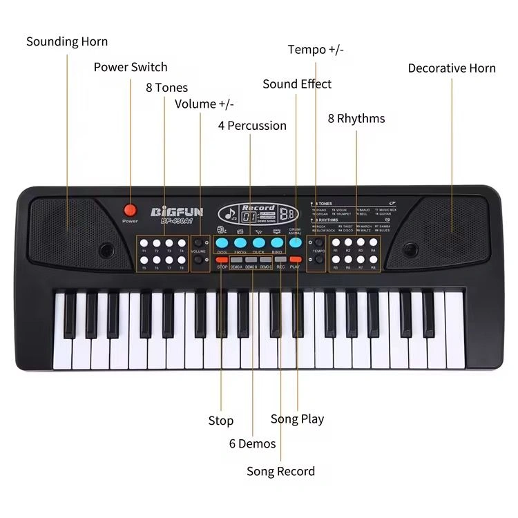 • Built-in 8 rhythms, 8 tones, 19 demos, 4 percussion/4 animal sounds.